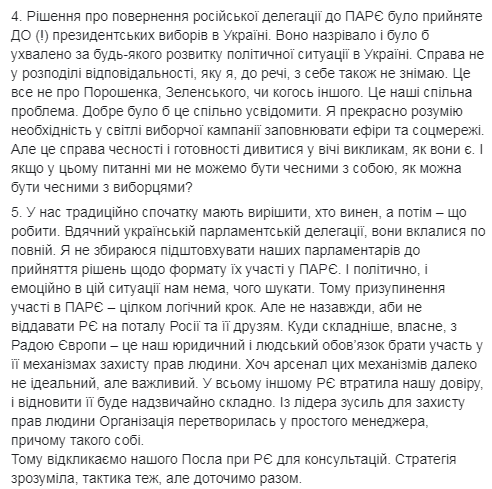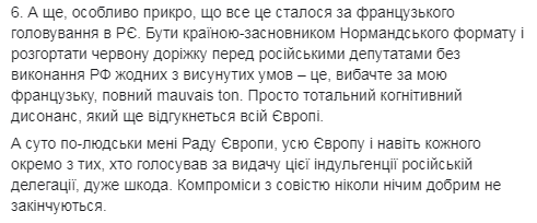 По словам главы МИД Украины, он благодарен украинской парламентской делегации, которая "выложилась по полной". Однако, он не собирается "подталкивать парламентариев к принятию решений о формате их участия в ПАСЕ".