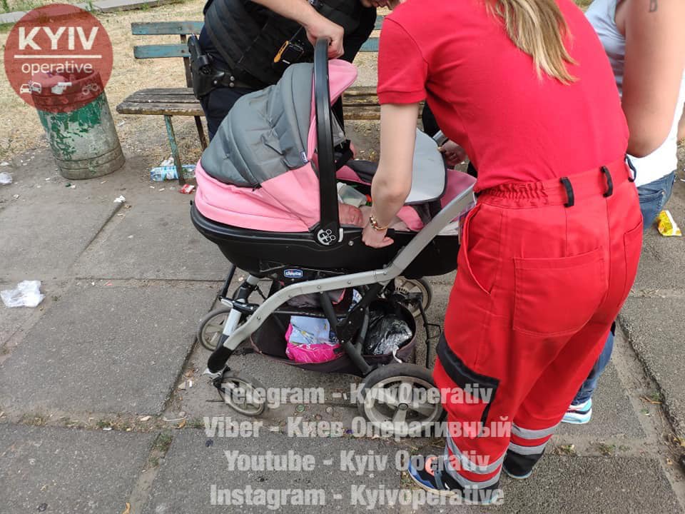 Отмечается, что сообщение о том, что неизвестные пьют спиртные напитки возле киоска, а рядом еще с 12 часов дня на палящем солнце в коляске плачет ребенок, киевские патрульные получили 23 июня около 19 часов.