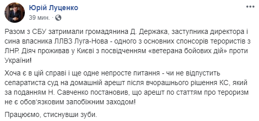 "Вместе с СБУ задержали гражданина Держака, замдиректора и сына владельца ЛЛВЗ "Луга-Нова" - одного из основных спонсоров террористов из "ЛНР". Деятель проживал в Киеве с удостоверением "ветерана боевых действий" против Украины! На все приходит время расплаты!", - сообщил он. Других подробностей Луценко не сообщил.