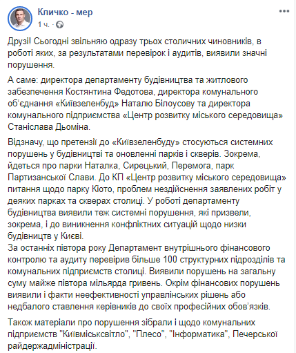 "Сегодня увольняю сразу трех столичных чиновников, в работе которых, по результатам проверок и аудитов, обнаружены значительные нарушения. А именно: директора департамента строительства и жилищного обеспечения Константина Федотова, директора коммунального объединения "Киевзеленстрой" Наталью Белоусову и директора коммунального предприятия "Центр развития городской среды" Станислава Демина", - написал Виталий Кличко.