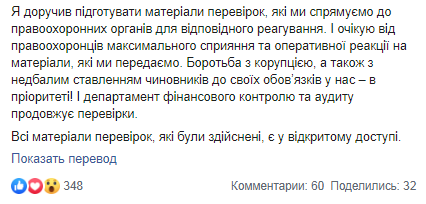 "За последние полтора года департамент внутреннего финансового контроля и аудита проверил более 100 структурных подразделений и коммунальных предприятий столицы. Выявили нарушений на общую сумму почти полтора миллиарда гривен. Кроме финансовых нарушений, обнаружили и факты неэффективности управленческих решений или халатного отношения руководителей к своим профессиональным обязанностям. Также материалы о нарушении собрали и относительно коммунальных предприятий "Киевмиськсвитло", "Плесо", "Информатика", Печерской райгосадминистрации", - написал Виталий Кличко.