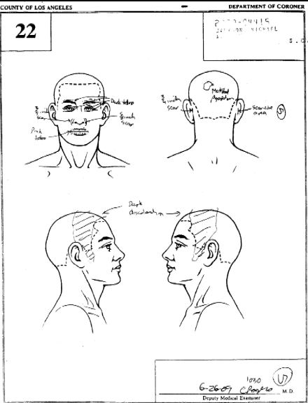 По словам следователей, которые осматривала тело Джексона после смерти, на голове певца были очень серьезные раны. "Это не человек, который должен был умереть. То, что было наиболее странным, когда я периодически смотрел на него - его голова. Потому что всегда, когда он был на публике, он носил парик. Глядя на его кожу, верхняя часть головы была в серьезных ранах", - рассказал один из полицейских.