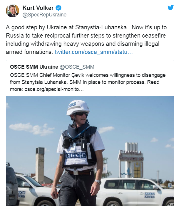 "Хороший шаг со стороны Украины в Станице Луганской. Теперь время России пойти на взаимные дальнейшие шаги для обеспечения прекращения огня, включительно с отводом тяжелого вооружения и разоружения незаконных вооруженных формирований", - написал Курт Волкер.