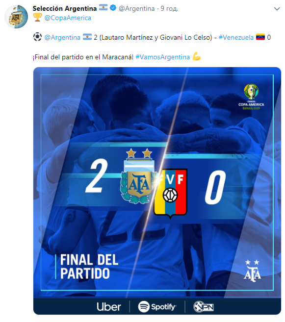Вчера, 28 июня, на Кубке Америки завершился второй матч четвертьфинала, в котором сборная Аргентины обыграла команду Венесуэлы, забив по голу в каждом тайме (2:0).