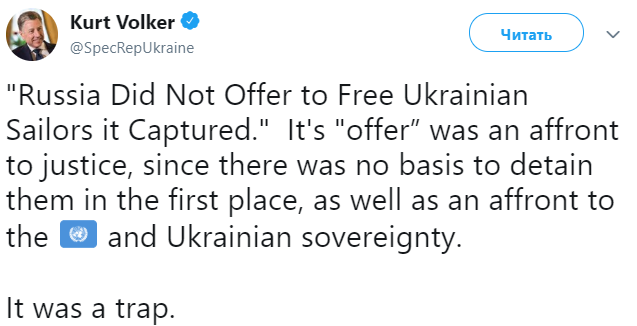 "Россия не предлагала освободить захваченных украинских моряков. "Это "предложение" было оскорблением правосудия, поскольку не было оснований для их задержания, а также оскорблением ООН и суверенитета Украины", - написал Волкер на своей странице в микроблоге Twitter.