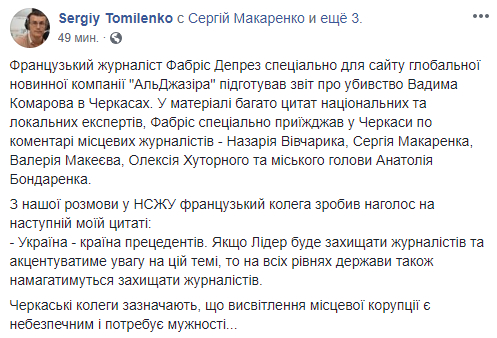 Как сообщил в Facebook председатель Национального союза журналистов Украины Сергей Томиленко, французский журналист Фабрис Депрез специально для сайта подготовил отчет об убийстве Вадима Комарова в Черкассах.
