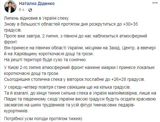 Сегодня, 1 июля, в большинстве областей Украины возобновится жара до +30...+35 градусов, но со вторника воздух немного посвежеет. Об этом в Facebook сообщила синоптик Наталья Диденко.