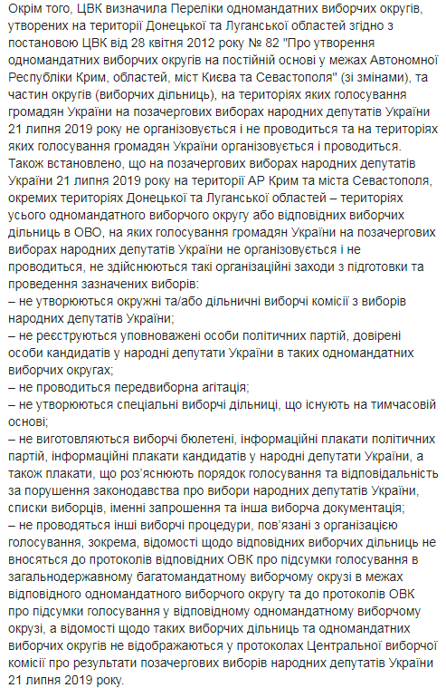 "ЦИК определила перечни одномандатных избирательных округов, образованных на территории Донецкой и Луганской областей, и частей округов, на территориях которых голосование граждан на выборах 21 июля не организуется и не проводится и на территориях которых голосование организуется и проводится", - говорится в заявлении.