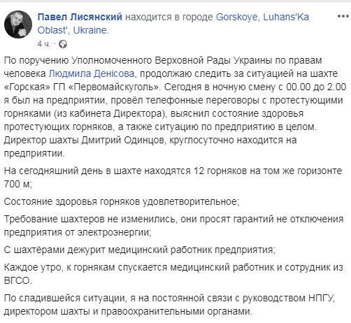 "Сегодня (3 июля) в ночную смену с 00:00 до 2:00 я был на предприятии, провел телефонные переговоры с протестующими горняками (из кабинета директора), выяснил состояние здоровья протестующих, а также ситуацию по предприятию в целом", - написал Лисянский.