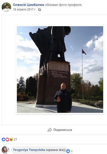 В Ивано-Франковске Цымбалюк сделал "застенчивую зигу" на фоне памятника Степану Бандере.