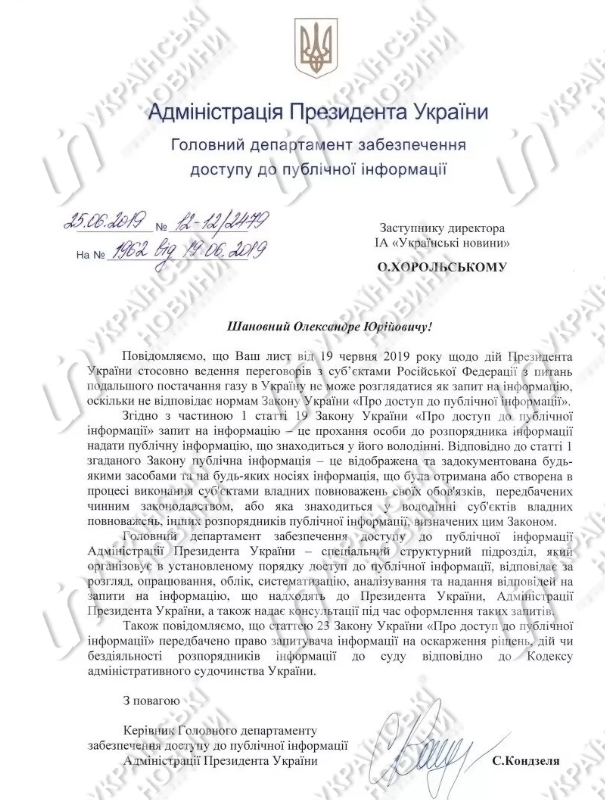 "Ваше письмо… не может рассматриваться как запрос на информацию, поскольку не соответствует нормам Закона "О доступе к публичной информации", - сказано в ответе Офиса президента.