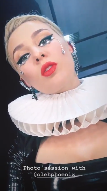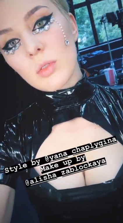 В фотосессии певица позирует в латексных костюмах, боди-сеточках и трико. При этом латексные трико не скрывают ее грудь.
