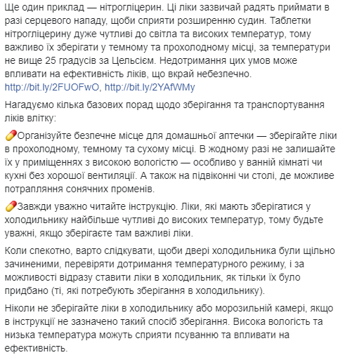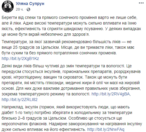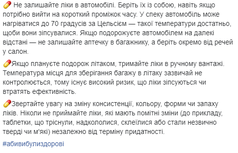 Глава Минздрава Ульяна Супрун рассказала о важных правилах хранения лекарственных препаратов летом. Она сообщила, что медицинские препараты лучше не оставлять под прямыми солнечными лучами, а некоторые лекарства небезопасно хранить в холодильнике. Об этом Супрун написала на своей странице в Facebook.