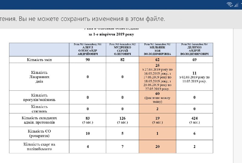 Он привел хронометраж служебной деятельности Зои Мельник за первое полугодие 2019 года. Согласно ведомости, за полугодие у патрульной были 62 рабочих смены, 60 опозданий (прогулов), поступило 20 жалоб, составлено 19 админпротоколов (за январь-май), ведется четвертое служебное расследование.