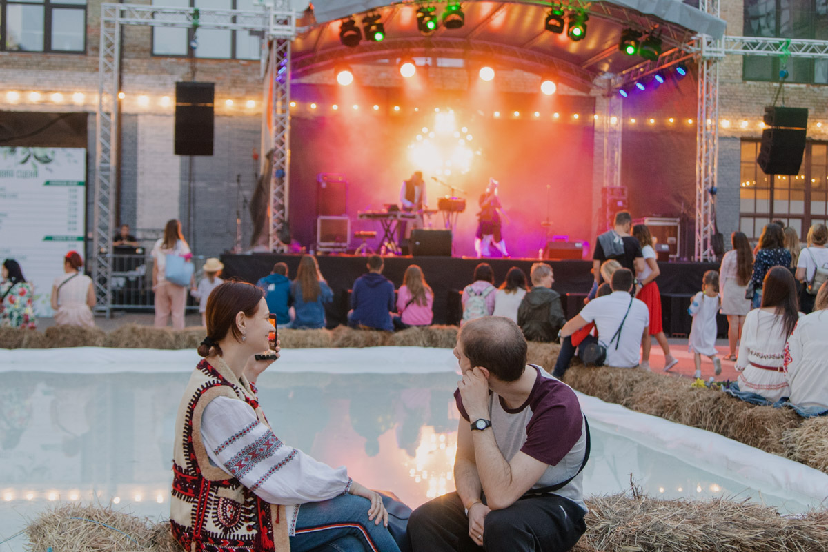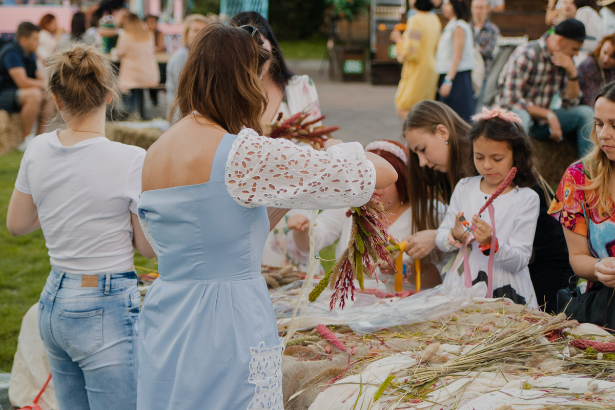Присутствующие на празднике выстраивались в очереди к гадалке, другие - за вкусной едой на стогах сена, а кто-то в это же время проходил увлекательный и загадочный квест в поисках легендарного цветка папоротника, который приносит счастье и любовь. На празднике можно было сделать красочные фото в пяти фотозонах, которые стали частью лабиринта. А после оказаться в торговом павильоне с интересными аксессуарами, одеждой, картинами и косметикой.По обе стороны локации размещались сцены, где гости могли сидеть на траве или пуфах, и даже качаться на гамаках.