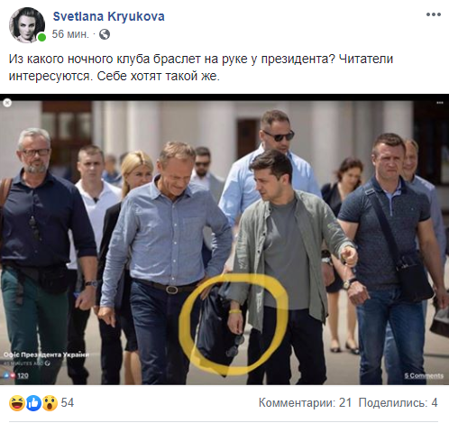 "Из какого ночного клуба браслет на руке у президента? Читатели интересуются. Себе хотят такой же", - иронизирует Светлана Крюкова в подписи к фото.
