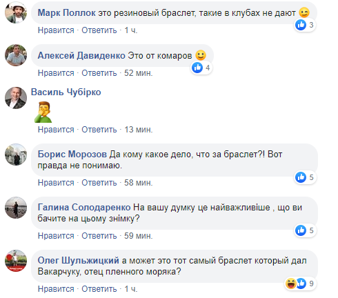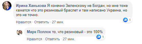 Тем временем подписчики принялись живо предлагать свои версии на тему того, с какой целью президент Украины надел на руку ярко-желтый аксессуар. Многие сходятся во мнении, что браслет выполнен из резины. Есть мнение, что такая вещица может предохранять от укусов насекомых. Некоторые предположили, что на руке Зеленского может оказаться браслет, который "Вакарчуку дал отец пленного моряка". Есть версия, что на браслете написано "Слава Украине",