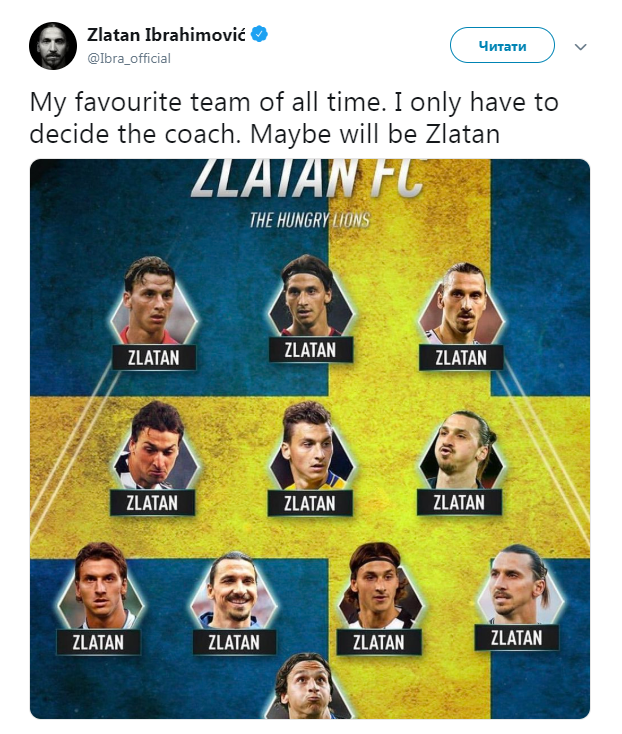 "Моя команда всех времен. Осталось только определиться с тренером. Может быть это будет Златан", - написал Ибрагимович.