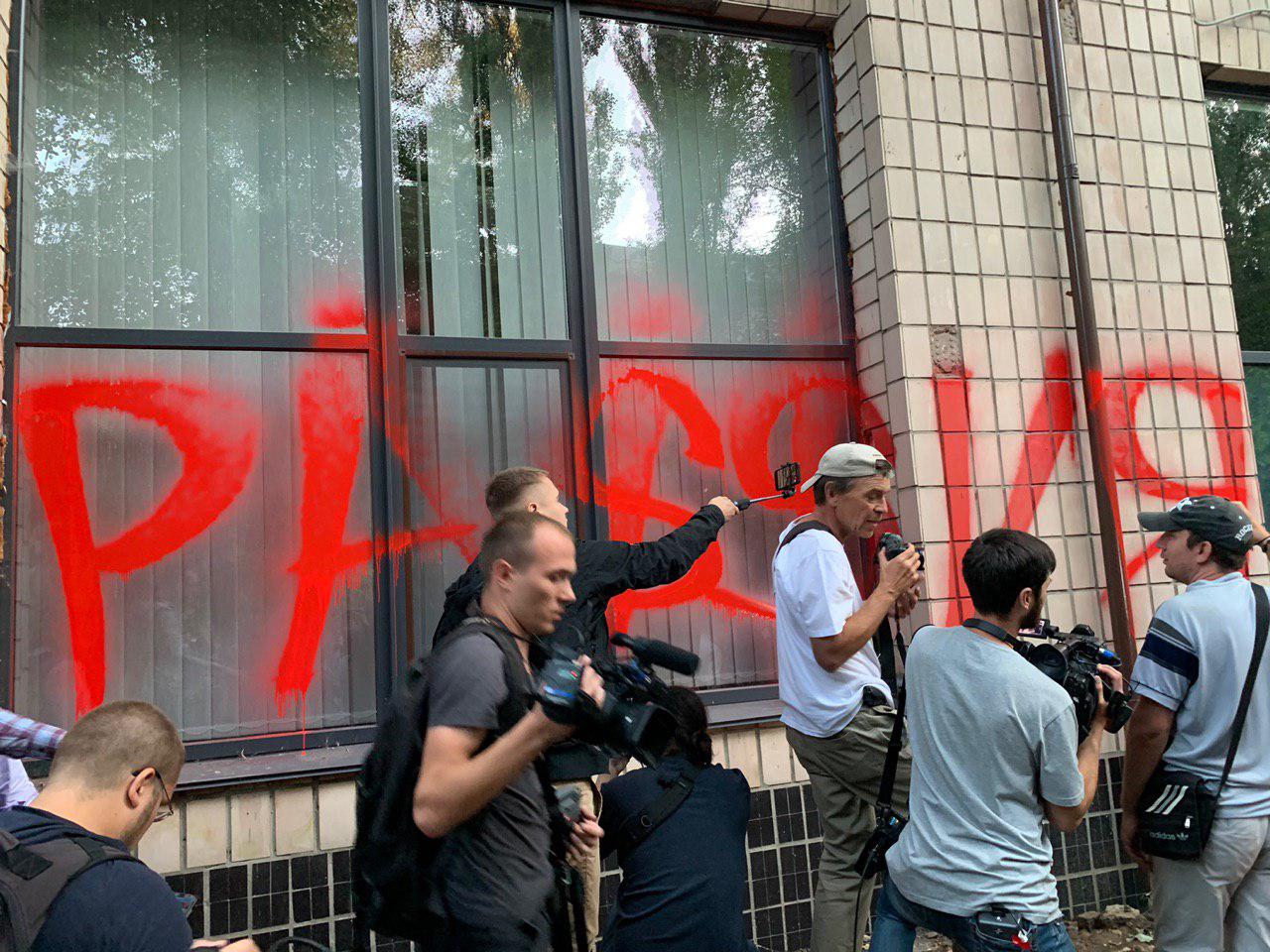 Как сообщает журналист "Страны", у здания канала находятся около трех сотен человек, среди которых члены Нацкорпуса и С14. Националисты жгут фаера, а на территорию комплекса, где расположен телеканал, залетают петарды. На кордоне выстроились бойцы Нацгвардии.