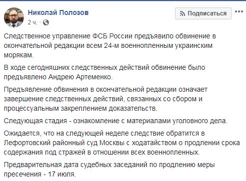 Координатор команды украинских моряков адвокатов Николай Полозов сообщил, что обвинение в окончательной редакции предъявлено следствием СУ ФСБ России всем 24 захваченным украинским морякам. Об этом адвокат написал в Facebook.