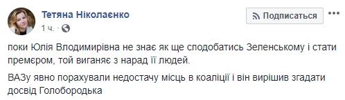 Журналист Татьяна Николаенко: "Пока Юлия Владимиривна не знает, как еще понравиться Зеленскому и стать премьером, он выгоняет с совещаний ее людей (изгнанный чиновник является членом Батькивщины - ред.).
