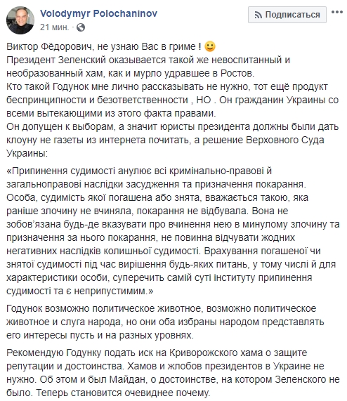 Рекомендую Годунку подать иск на Криворожского хама о защите репутации и достоинства. Хамов и жлобов президентов в Украине не нужно. Об этом и был Майдан, о достоинстве, на котором Зеленского не было. Теперь становится очевиднее почему".