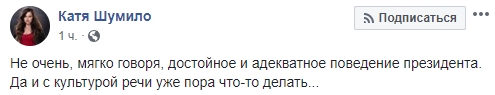 Журналист Екатерина Шумило: "Не очень, мягко говоря, достойное и адекватное поведение президента. Да и с культурой речи уже пора что-то делать..."
