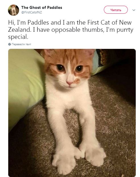 Ардерн взяла животное из приюта. Прозвище Paddles ("Вёсла") ей принесли лишние пальцы на лапах. На ее аккаунт в Twitter подписались 10 тысяч человек. А громким мяуканьем она едва не сорвала телефонный разговор Джасинды Ардерн с Дональдом Трампом.