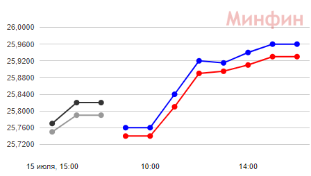 К 09:00 межбанк еще не начал торги. 15 июля он закрылся с котировками 25,79 грн (покупка) и 25,82 грн (продажа). То есть вчера на межбанке доллар подорожал на 4 копейки за день. При этом общий объем торгов был небольшим - около  $150 млн (при $300 млн и выше на максимуме).