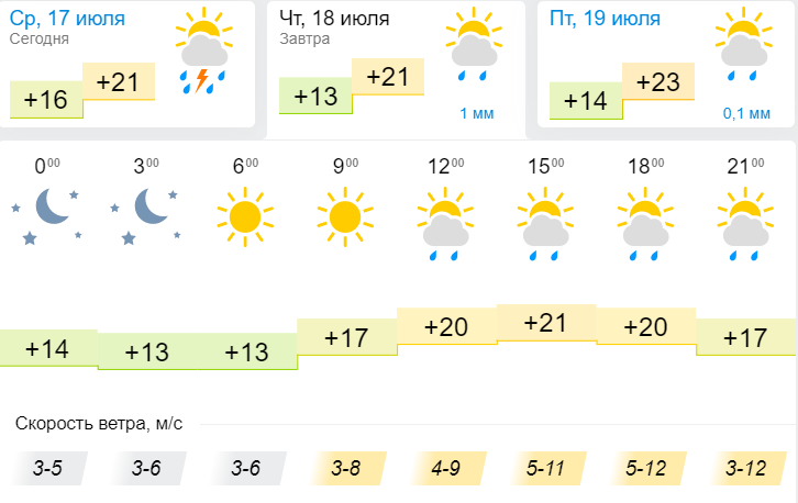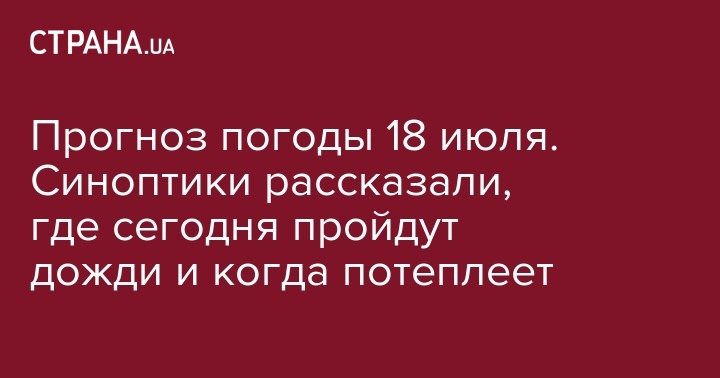 В четверг, 18 июля, погода приготовила украинцам пасмурное небо с дождями в шести городах - Киеве, Чернигове, Сумах, Житомире, Ровно и Луцке. В остальных регионах осадков не ожидается. "Страна" собрала информацию о сегодняшней погоде по данным трех ведущих сайтов о погоде: Укргидрометцентра, Gismeteo и Sinoptik.