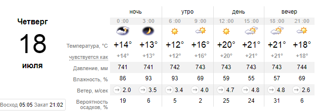 18 июля солнце в Киеве взойдет в 05:05. Закат - в 21:02. Долгота дня - 15:55. За последние 130 лет наблюдений максимальная температура 18 июля достигала +34,4 в 2007 году. Минимальная была зафиксирована в 1989 году и составила +9,4.