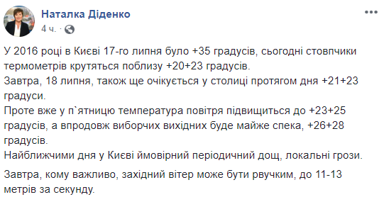 Синоптик Наталья Диденко сообщает, что 18 июля в Киеве днем ожидается +21...+23. Для июля это нетипичные и холодные показатели. В 2016 году в середине июля столбики термометров в столице поднимались до +35.