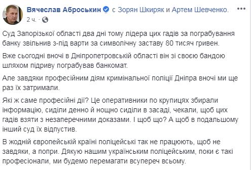 В Днепропетровской области группа бандитов вместе со своим лидером, которого всего два дня назад выпустили под залог в 80 000 грн, подорвала банкомат. Об этом сообщил на своей странице в Facebook первый заместитель главы Нацполиции Вячеслав Аброськин.
