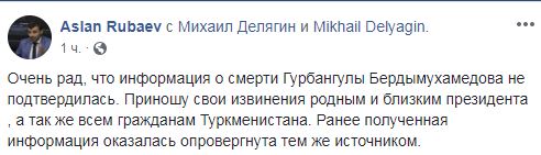 Директор Центра мониторинга евразийских проблем, политолог Аслан Рубаев заявил, что информация о смерти президента Туркменистана Гурбангулы Бердымухамедова не подтвердилась и он приносит по этому проводу свои извинения. Об этом он написал в своем Facebook.