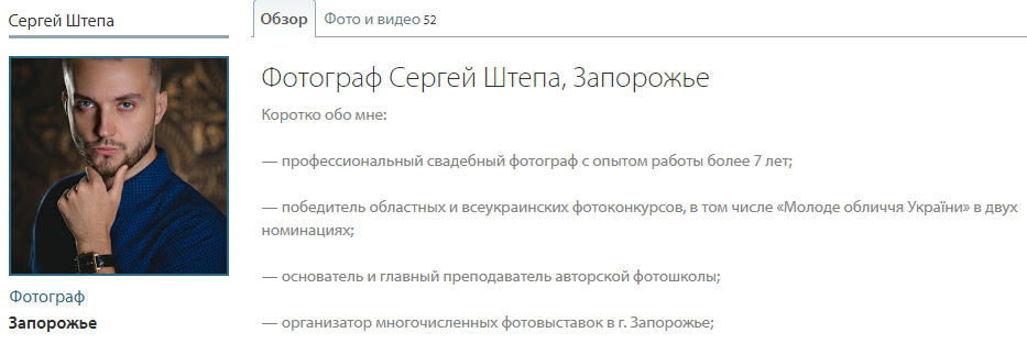 В краткой биографической справке на сайте ЦИК говорится, что Сергей Штепа временно не работает. Этот кандидат от "Слуги народа" известен в Запорожье, как свадебный фотограф. В резюме, размещенном на специализированных свадебный сайтах, Сергей Штепа сообщает, что снимает свадьбы уже более 7 лет, создал свою фотошколу в Запорожье, участвовал в организации выставок.