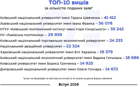 В частности, в ТОП-10 вузов по количеству поданных заявлений попали: Киевский национальный университет имени Тараса Шевченко – 41412 заявлений, Львовский национальный университет имени Ивана Франко - 36078, НТУУ "Киевский политехнический институт имени Игоря Сикорского" - 35242, НУ "Львовская политехника" - 29939, Киевский национальный торгово-экономический университет – 24233, Национальный авиационный университет – 22324, Харьковский национальный университет имени В.Каразина – 19379, Киевский национальный экономический университет имени Вадима Гетьмана – 18686, Киевский университет имени Бориса Гринченко – 14925 и Днепровский национальный университет имени Олеся Гончара - 14672 заявлений.