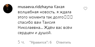 Другие пишут слова поддержки: "Какая волшебная новость. Ждала этого момента так долго, спасибо вам Таисия Николаевна... Ждем вас всем сердцем и душой".
