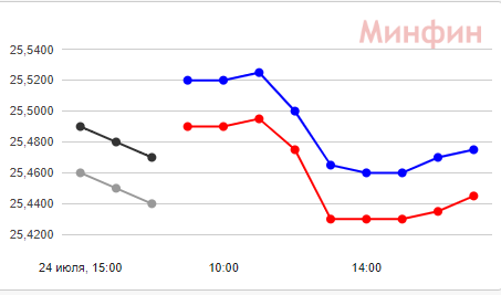 Торги на межбанке начались с 10:00 с котировок 25,44-25,47 грн (то есть с 24 июля доллар просел на 12 копеек).