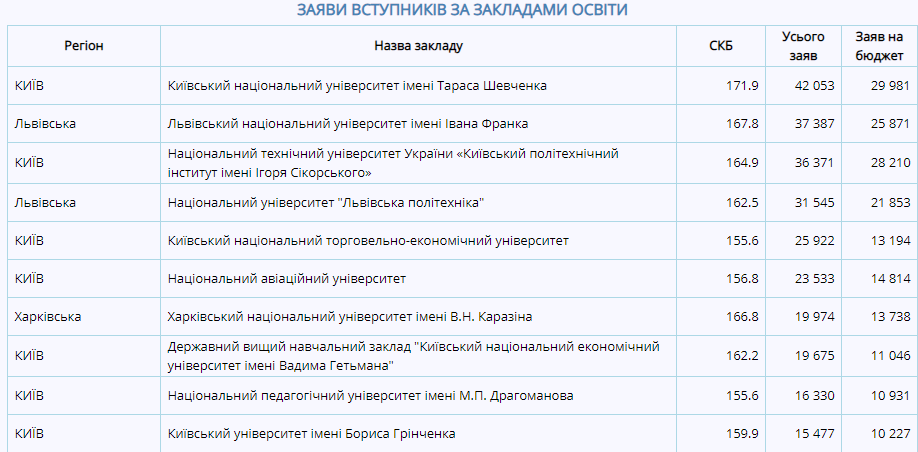 Судя по количеству поданных заявлений самым желанным для абитуриентов является Университет им. Шевченко в Киеве. В этом году туда подали более 42 тысяч заявлений, причем почти 30 тысяч из них - на бюджет.