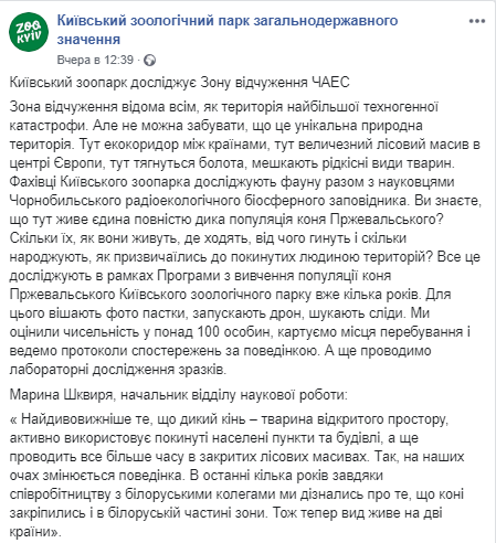 "Вы знаете, что здесь живет единственная полностью дикая популяция лошади Пржевальского? Сколько их, как они живут, где ходят, от чего погибают и сколько рожают, как привыкли к брошенным человеком территориям? Все это исследуют в рамках Программы по изучению популяции лошади Пржевальского Киевского зоологического парка уже несколько лет", - говорится в публикации.