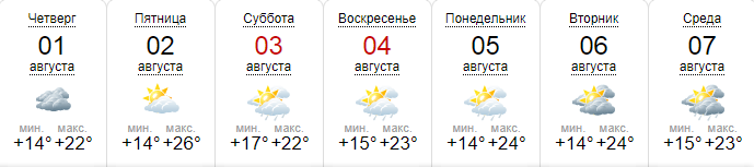 По данным Sinoptik.ua, первая неделя августа будет нежаркой: +22...+26. Часто будет идти дождь: 3,4,5 и 7 августа.