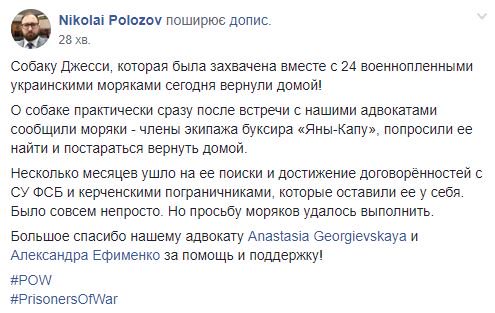 "Собаку Джесси, которая была захвачена вместе с 24 военнопленными украинскими моряками, сегодня вернули домой! О собаке практически сразу после встречи с нашими адвокатами сообщили моряки - члены экипажа буксира "Яны Капу", попросили ее найти и постараться вернуть домой. Несколько месяцев ушло на ее поиски и достижение договоренностей с СУ ФСБ и керченскими пограничниками, которые оставили ее у себя", - написал Полозов.