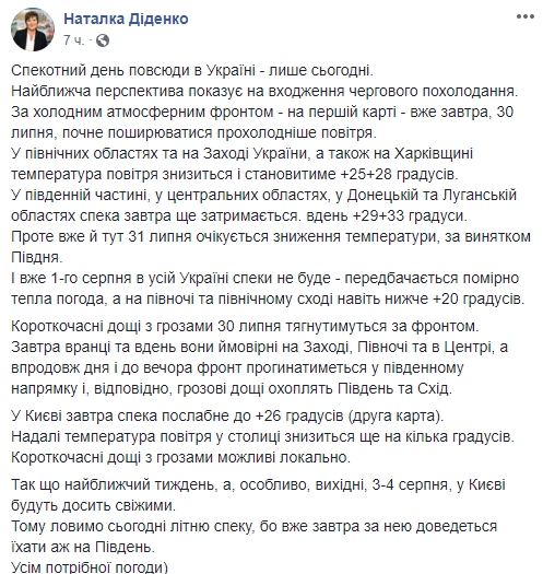 С 1 августа во всей Украине жары не будет - предполагается умеренно теплая погода, а на севере и северо-востоке даже ниже +20 градусов, сообщила синоптик Наталья Диденко в своем Facebook. Ближайшая неделя, а особенно выходные, 3-4 августа, в Киеве будут достаточно свежими, добавила она.