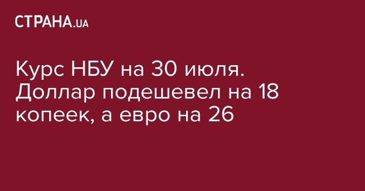 Национальный банк Украины установил официальный курс основных валют по отношению к гривне на 30 июля. По сравнению с предыдущим банковским днем, доллар подешевел еще на 18 копеек. Об этом свидетельствует информация на сайте регулятора