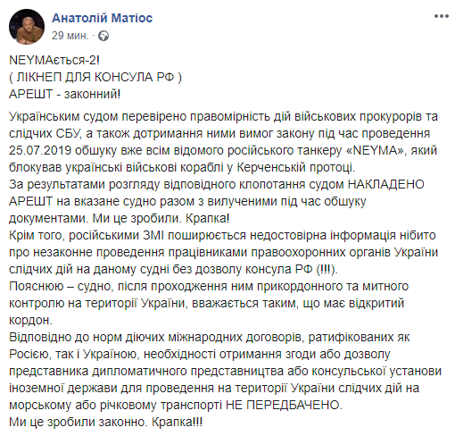 Также Анатолий Матиос отметил, что украинский суд проверил правомерность действий военных прокуроров и следователей Службы безопасности Украины, а также соблюдение ими требований закона при проведении обыска на российском танкере 25 июля.