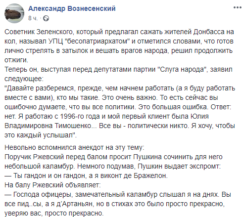 "Советник Зеленского, который предлагал сажать жителей Донбасса на кол, называл УПЦ "бесопатриархатом" и отметился словами, что готов лично стрелять в затылок и вешать врагов народа, решил продолжить отжиги.