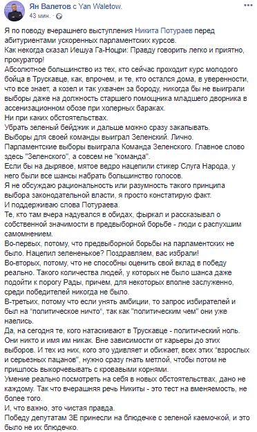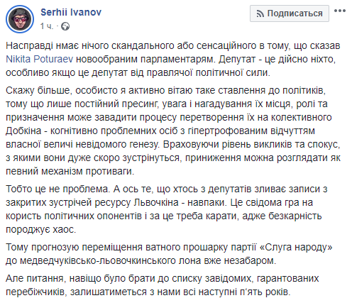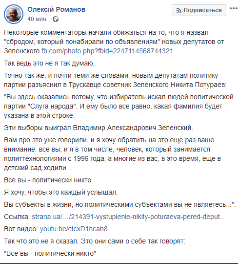 "Некоторые комментаторы начали обижаться на то, что я назвал "сбродом, который понабирали по объявлениям" новых депутатов от Зеленского. Так ведь это не я так думаю. Точно так же, и почти теми же словами, новым депутатам политику партии разъяснил в Трускавце советник Зеленского Никита Потураев...