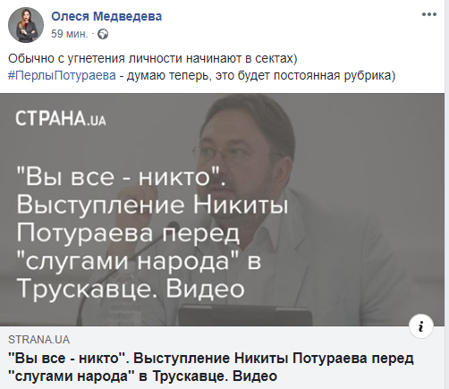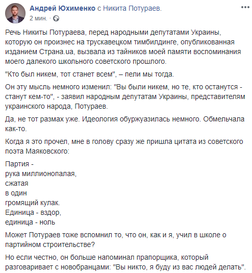 "Речь Никиты Потураева, перед народными депутатами Украины, которую он произнес на трускавецком тимбилдинге, опубликованная изданием Страна.ua, вызвала из тайников моей памяти воспоминания моего далекого школьного советского прошлого.