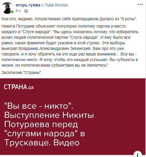 "Кое-кто, видимо, почувствовал себя прапорщиком Дыгало из "9 роты". Никита Потураев объясняет популярно политику партии и место каждого в "Слуге народа".