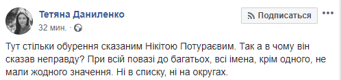 "Тут столько возмущения сказанным Никитой Потураева. Так а в чем он сказал неправду? При всем уважении ко многим, все имена, кроме одного, не имели никакого значения. Ни в списке, ни в округах", - написала журналист Татьяна Даниленко.